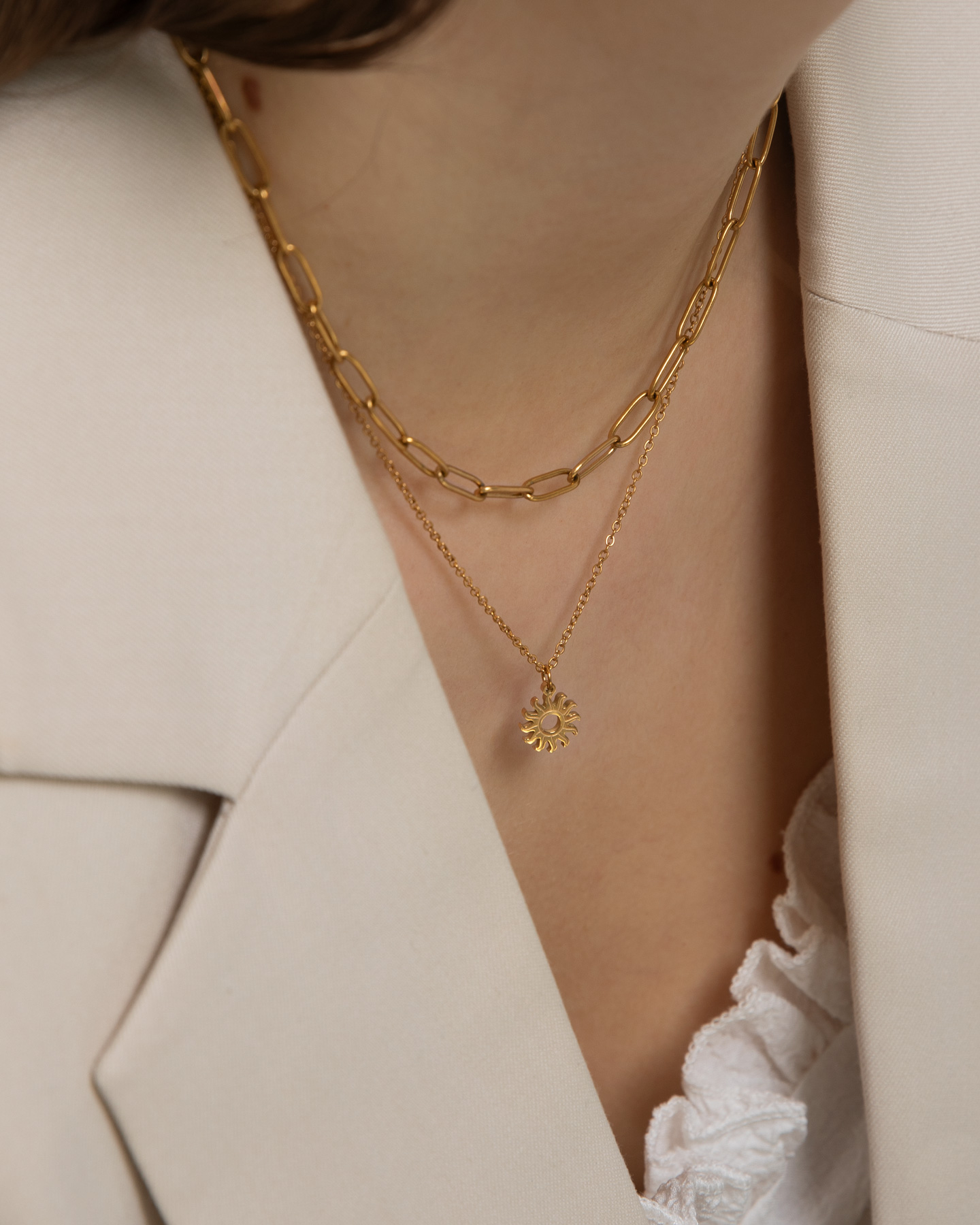Solis begleitet dich durch Tag und Nacht - denn du strahlst von innen. Die Kette Solis lässt sich mit jedem Casual Outfit verbinden.